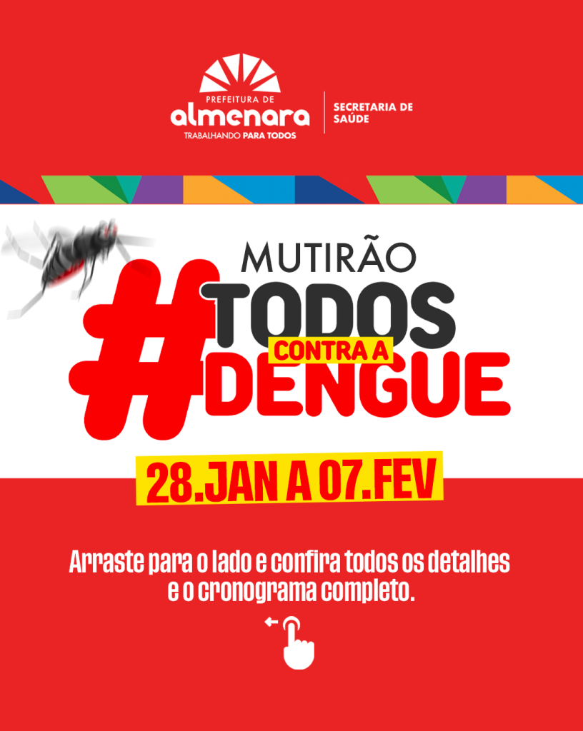 De 28 de janeiro a 7 de fevereiro, a Prefeitura de Almenara, através da Secretaria Municipal de Saúde estarão unindo forças para combater a dengue. Descarte os materiais corretos que constam nos cards informativos.???? Cronograma por bairros: Planalto – Terça (28/JAN) Santo Antônio – Quarta (29/JAN) Cidade Verde – Quinta (30/JAN) Horários: 7h às 11h e 13h às 17h Em breve informaremos o cronograma dos outros bairros. Participe! Sua colaboração é essencial para proteger nossa cidade. #SaúdeParaTodos #AlmenaraContraaDengue #PrefeituraDeAlmenara