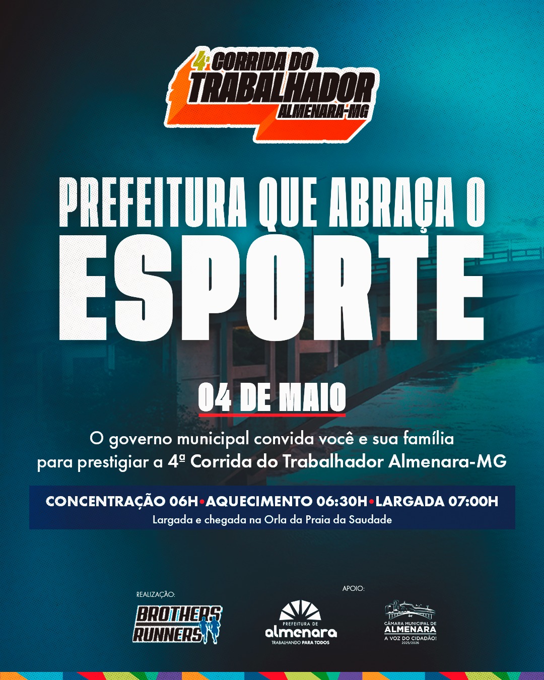 No dia 04 de maio, vamos juntos prestigiar a 4ª Corrida do Trabalhador de Almenara-MG. Um evento especial pensado para reunir atletas, famílias e toda a comunidade em uma manhã de saúde, lazer e integração.