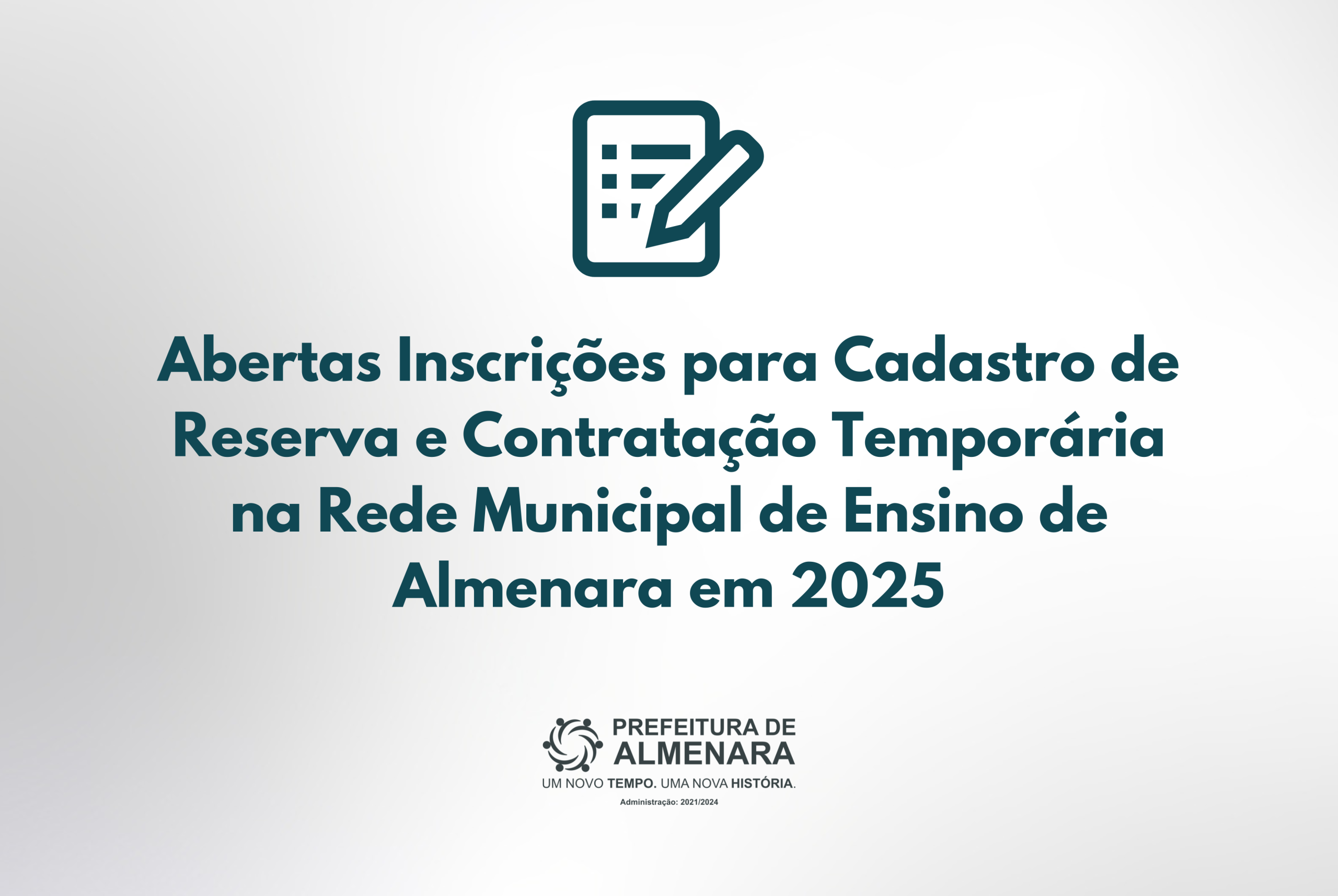 A Prefeitura de Almenara, por meio da Secretaria Municipal de Educação, informa que estão abertas as inscrições para o Cadastro de Reserva e para a convocação de contratação temporária de profissionais para atuar na Rede Municipal de Ensino durante o ano letivo de 2025. Esta ação tem como principal objetivo suprir a demanda de pessoal nas escolas municipais, garantindo o bom funcionamento do sistema educacional e a qualidade do ensino oferecido às crianças e jovens da cidade.