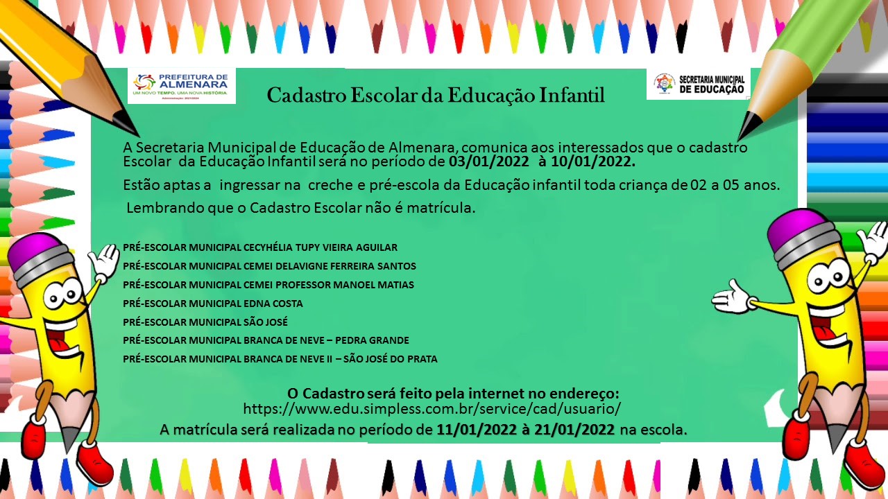 Já está aberto o Cadastro Escolar da Educação Infantil Para fazer o seu cadastro, é só clicar no link abaixo: Link: https://www.edu.simpless.com.br/service/cad/usuario/