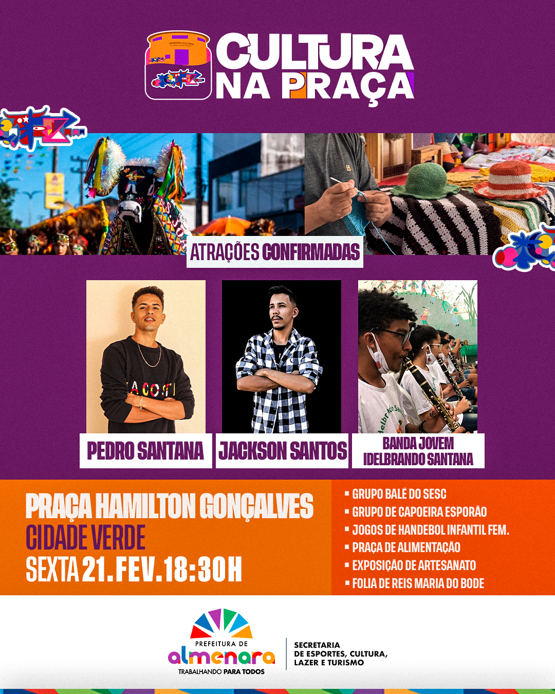 Grupo Baile do SESC, Grupo de Capoeira Esporte, Jogos de Handebol Infantil Feminino, Exposição de Artesanato, Folia de Reis Maria do Bode.