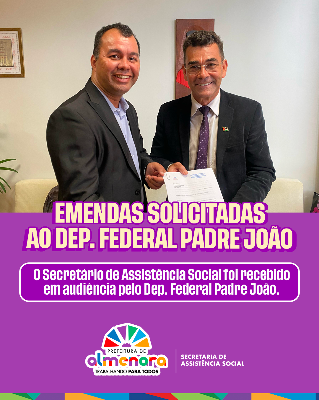O Secretário de Assistência Social, Anderson Lisboa, se reuniu com o Dep. Federal Padre João para apresentar o planejamento da pasta e solicitar emendas para a construção da Casa de Acolhimento de Crianças e Adolescentes, além de outros recursos para fortalecer as políticas sociais do município.